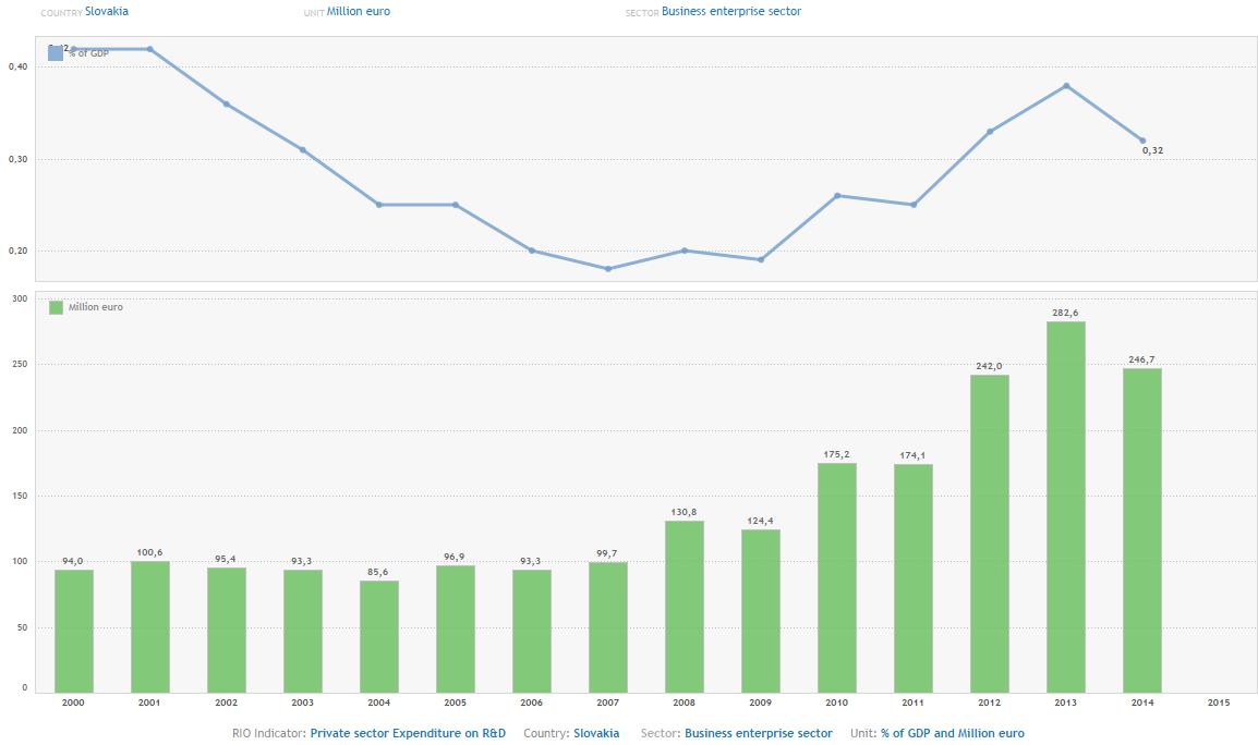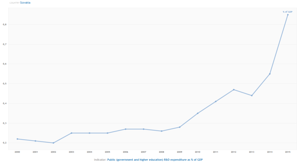 Do výskumu a vývoja v Európe najviac investuje Švédsko, Rakúsko, Dánsko, Fínsko a Nemecko. Švédsko podľa posledných údajov z roku 2015 investovalo do výskumu a vývoja až 3,26% HDP. Priemer Európskej únie je 2,01%. Slovensko obsadilo 18. priečku s 1,18% čo je približne 59% európskeho priemeru. Tvrdí to najnovšia štúdia Európskej komisie Research and Innovation Observatory (RIO).