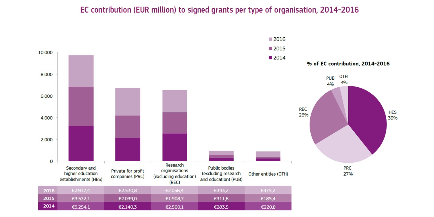 - najúspešnejšie sú verejné organizácie (26,4%) a výskumné organizácie (17,7%) a najnižšie sú súkromné firmy (13,5%) a univerzity (13,1%)