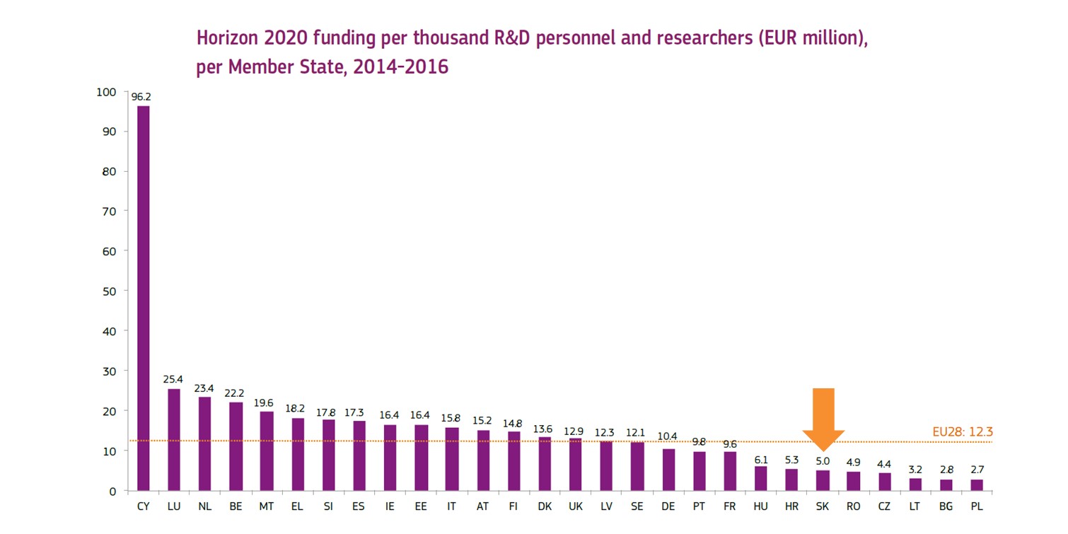 - priemerný príspevok na tisícku výskumníkov je 5 mil. eur (23. miesto v EÚ)