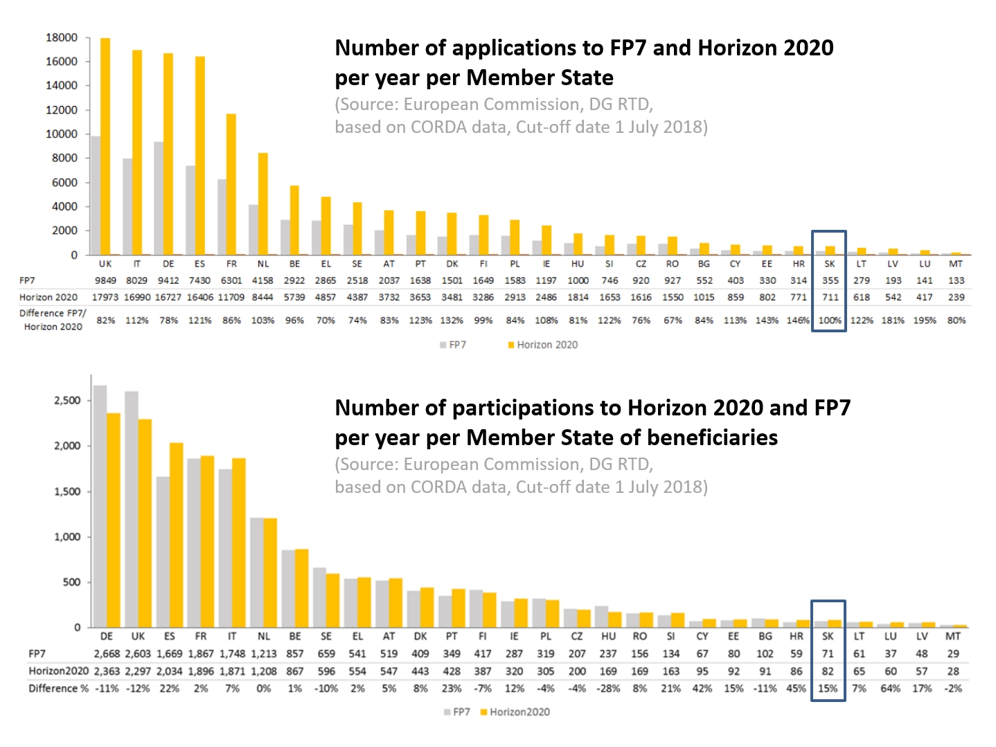 Nižšie uvedené grafy ukazujú výsledky členských krajín v podaných (graf 1) a úspešných projektoch (graf 2) a zmeny v H2020 oproti 7.RP: