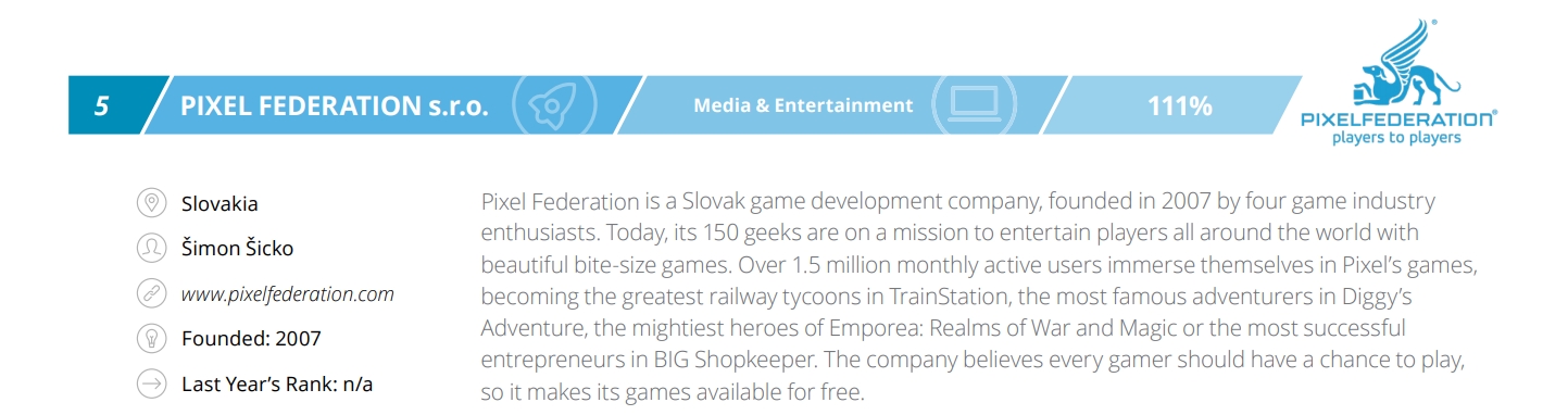 Medzi BIG 5 sa umiestnila na 5. miesto slovenská firma Pixel Federation: