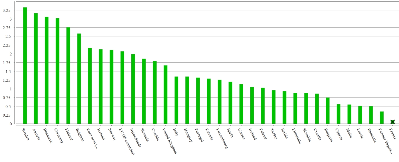 Kým susedné Rakúsko podľa Eurostatu investuje 3,16 % HDP, Slovensko je s investíciami 0,88 % spolu s Rumunskom (0,5 %), Lotyšskom (0,51 %), Maltou (0,55 %) a Cyprom (0,56 %) medzi poslednými.