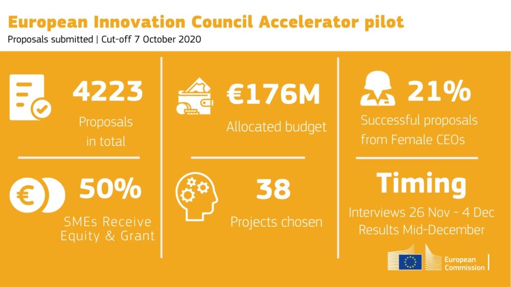 Európska komisia vybrala 38 z najsľubnejších európskych start-upov a malých a stredných podnikov, ktoré dostanú financovanie vo výške od 1 do 17 miliónov EUR na vývoj a rozšírenie prelomových inovácií v Európe. Toto je posledné kolo financovania v pilotnej fáze akcelerátora Európskej rady pre inovácie (EIC), ktoré zaregistrovalo viac ako 4200 žiadostí, čo je doteraz vôbec najvyšší počet.