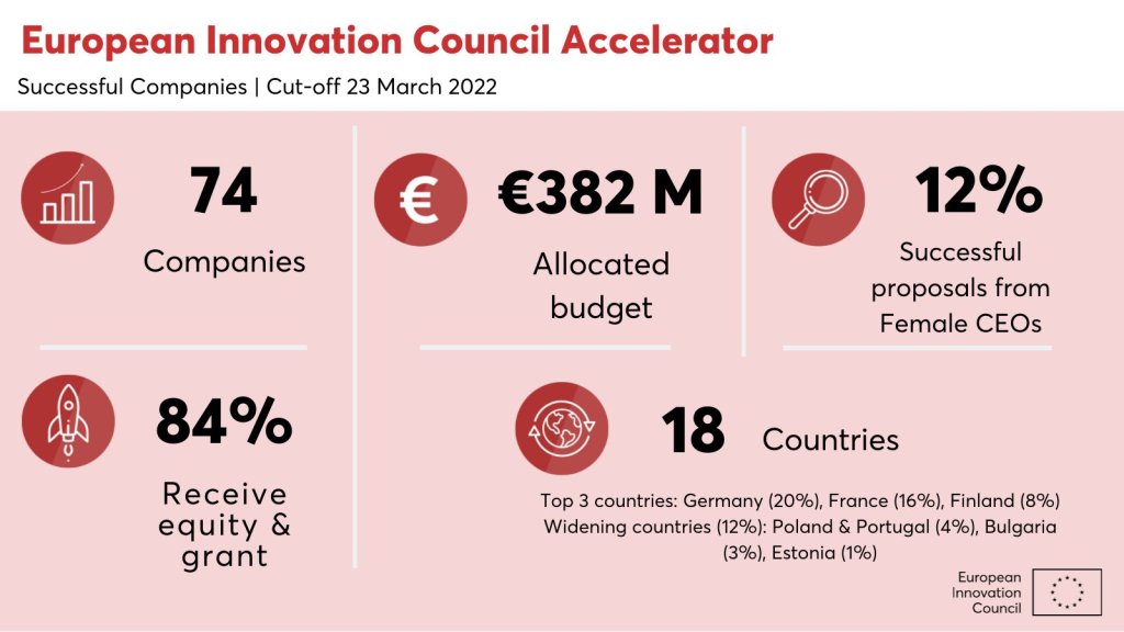 Z marcovej uzávierky EIC Accelerator 2022 Európska komisia vybrala 74 inovatívnych spoločností. Tie majú získať finančné prostriedky vo výške až 382 miliónov EUR vo forme kombinácie grantov a investícií. Spoločnosti boli vybrané z viac ako 1 000 startupov a MSP, ktoré predložili úplnú žiadosť o financovanie v rámci uzávierky 23. marca 2022, z ktorých 266 (vrátane jednej slovenskej) bolo vypočutých porotami zloženými zo skúsených investorov a podnikateľov. Každá z vybraných spoločností získa granty a/alebo kapitálové investície v závislosti od svojich potrieb až do výšky 17,5 milióna EUR.