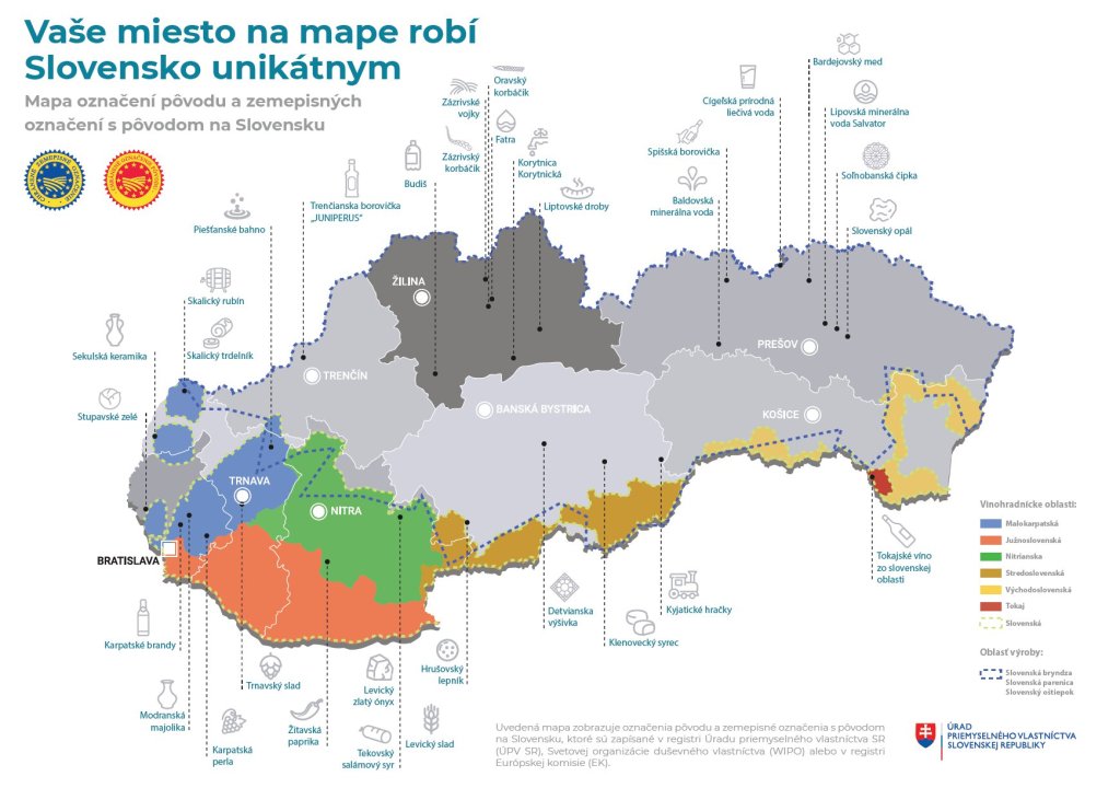 Pozrite si mapu označenia pôvodu a zemepisného označenia s pôvodom na Slovensku, ktoré sú zapísané v registri Úradu priemyselného vlastníctva SP (ÚPV SP), Svetovej organizácie duševného vlastníctva (WIPO) alebo v registri Európskej komisie (EK):