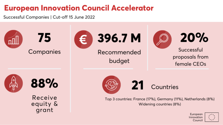 Európska komisia vybrala 75 inovatívnych startupov po druhej (júnovej) tohtoročnej uzávierke programu EIC Accelerator. Porota zložená zo skúsených investorov a podnikateľov vypočula 232 spoločností z celkového počtu viac ako 1 000 žiadostí. Spolu 75 vybraných spoločností získa finančné prostriedky vo výške takmer 400 miliónov EUR vo forme kombinácie grantov a kapitálových investícií.