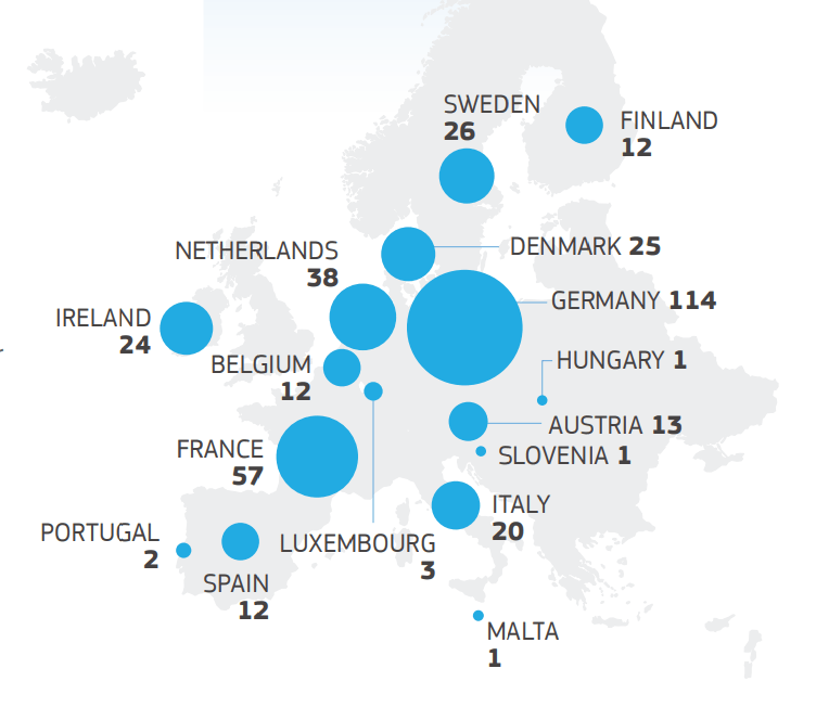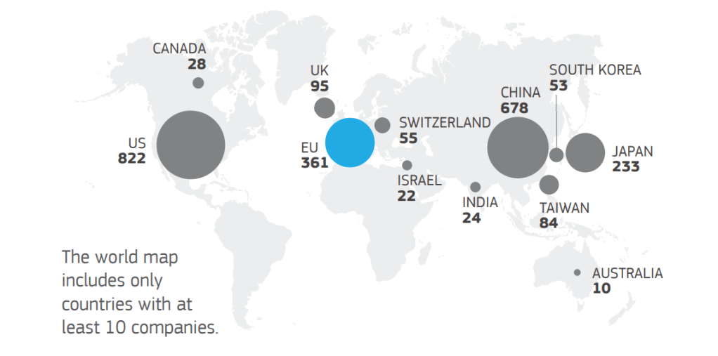 Do prvej 2500-ky patrí 361 spoločností so sídlom v EÚ, na ktoré pripadá 17,6 % celkových investícií do výskumu a vývoja, 822 spoločností z USA (40,2 %), 678 čínskych spoločností (17,9 %), 233 japonských spoločností (10,4 %) a 406 spoločností zo zvyšku sveta (RoW, 13,9 % výskumu a vývoja). Do skupiny RoW patria spoločnosti z Južnej Kórey (53), Švajčiarska (55), Spojeného kráľovstva (95), Taiwanu (84) a spoločnosti so sídlom v ďalších 18 krajinách.