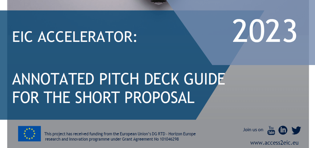 Prihláška na krátky návrh EIC Accelerator pozostáva z 3 častí: online formulár, video a pitch deck. Práve k poslednej časti pripravil projekt spájajúci Národné kontaktné body programu Horizont Európa pre inovácie príručku s odporúčaniami, čo by v tejto prezentácii nemalo chýbať.
