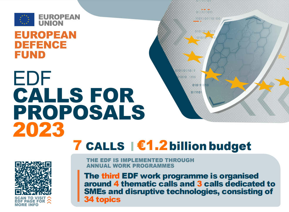 Pracovný program Európskeho obranného fondu (European Defence Fund) na rok 2023 poskytne 1,2 miliardy EUR na výskum, vývoj a inovácie v oblasti obrany prostredníctvom každoročných výziev na predkladanie návrhov. Výzva je otvorená do 22. novembra 2023.