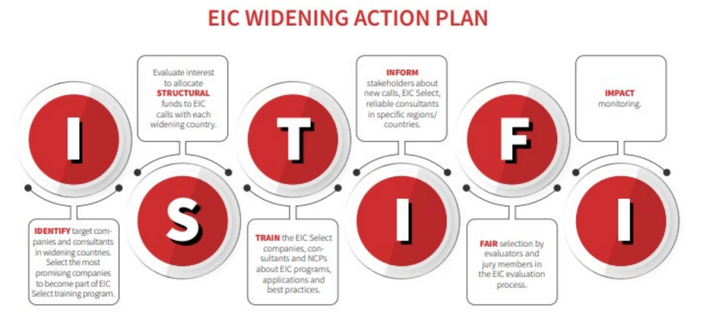 Hoci Rada EIC plne podporuje zásadu excelentnosti pri prideľovaní finančných prostriedkov EIC, je presvedčená, že v widening krajinách* existuje nevyužitý potenciál excelentnosti. Už boli podniknuté významné kroky na zlepšenie účasti inovátorov s vysokým potenciálom z widening krajín, ako napríklad program “Hop On” financovanie ďalších partnerov z widening krajín, ktorí sa môžu zapojiť do projektov EIC Pathfinder. Vďaka tejto a ďalším činnostiam sa úroveň účasti v minulom roku neustále zvyšovala.
