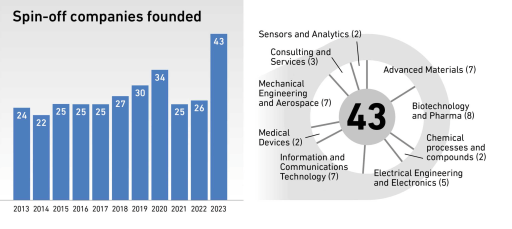 V roku 2023 bol zaznamenaný rekordný počet 43 nových spin-off spoločností založených na ETH (Eidgenössische Technische Hochschule) Zürich, najmä v oblastiach umelej inteligencie a biotechnológie. Medzi nimi boli aj firmy ako Quazel, aplikácia na učenie jazykov pomocou AI, a ATLyphe, ktorá sa zameriava na náhradu chemoterapie terapiami založenými na protilátkach.
