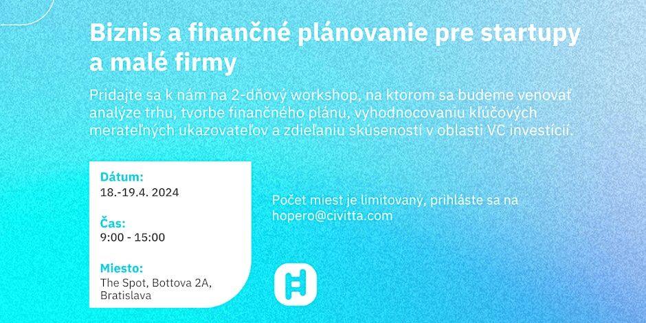 CIVITTA a HOPERO organizujú 2-dňový workshop pre startupy, na ktorom sa budú venovať analýze trhu, tvorbe finančného plánu, vyhodnocovaniu kľúčových merateľných ukazovateľov a zdieľaniu skúseností v oblasti VC investícií.