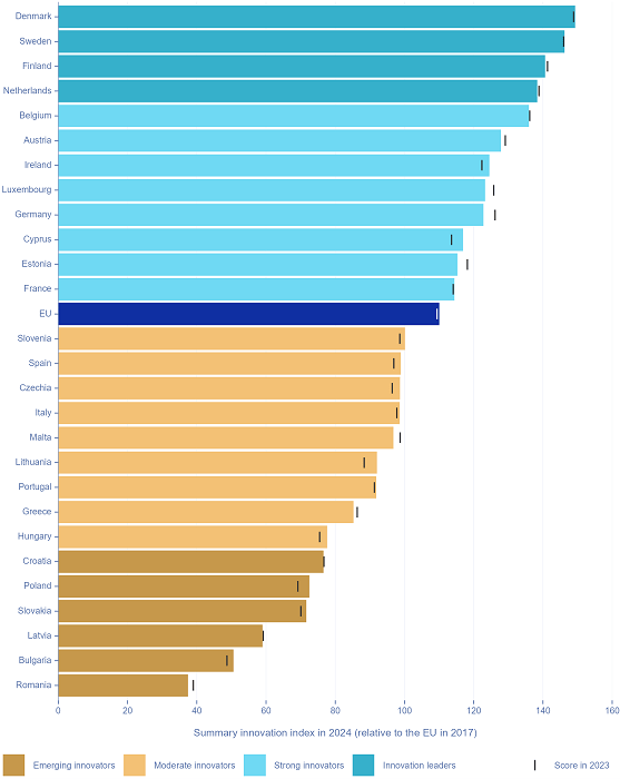 Európska komisia vydala nové vydanie European Innovarion Scoreboard, v ktorom konštatuje, že výkonnosť inovácií v Európskej únii pokračuje v stabilnom raste, pričom od roku 2017 vzrástla o 10 % a medzi rokmi 2023 a 2024 o 0,5 %. Podľa najnovšej edície Európskeho inovačného hodnotenia (EIS) z roku 2024 väčšina členských štátov zlepšila svoju inovačnú výkonnosť, hoci tempo rastu sa líši medzi jednotlivými krajinami. Dánsko si zachovalo pozíciu najinovatívnejšej krajiny EÚ, pričom Estónsko sa zaradilo medzi silných inovátorov a Belgicko kleslo do tejto kategórie.