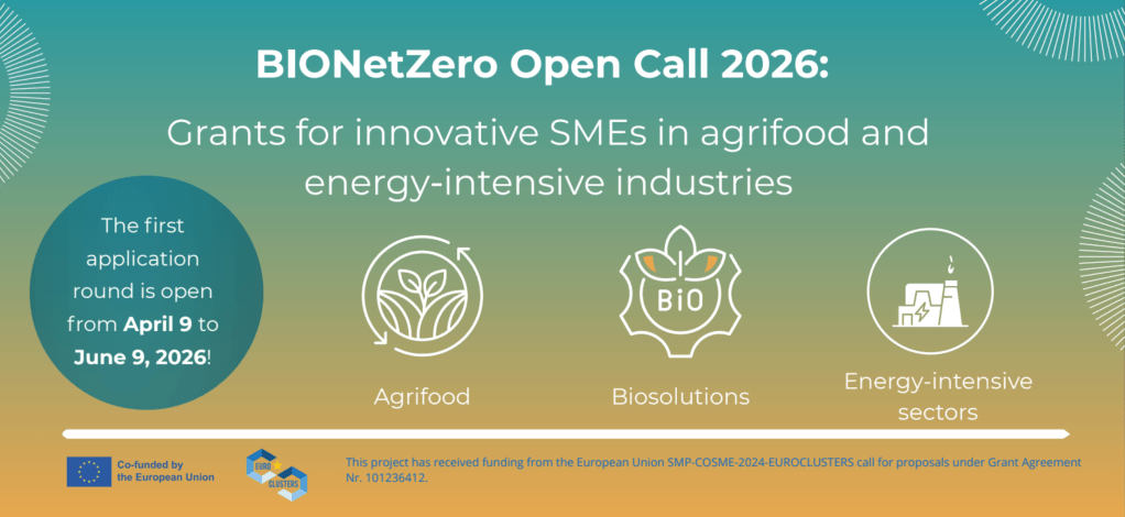 Výzva BIONetZero Open Call 2026 je zameraná na podporu inovatívnych MSP a startupov vyvíjajúcich biosolutions pre agropotravinárstvo a energeticky náročné odvetvia, pričom financuje aktivity od vývoja a testovania prototypov až po prípravu na trh a investorov; firmy môžu získať kombináciu grantov (spolu max. 60 000 € pri 25 % spolufinancovaní) vrátane podpory na technický vývoj, implementáciu, internacionalizáciu a networking, pričom cieľom je urýchliť prechod k net-zero riešeniam a posilniť európsku bioekonomiku; výzva je otvorená pre firmy s riešeniami v štádiu TRL 4–8 z krajín EÚ a SMP, s prvým kolom otvoreným od 9. apríla do 9. júna 2026